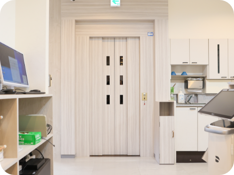 院内はバリアフリー、2階へはエレベーターも設置しておりますので、車いすの方、ベビーカーでお子様連れの方もそのまま治療台まで移動いただけます。