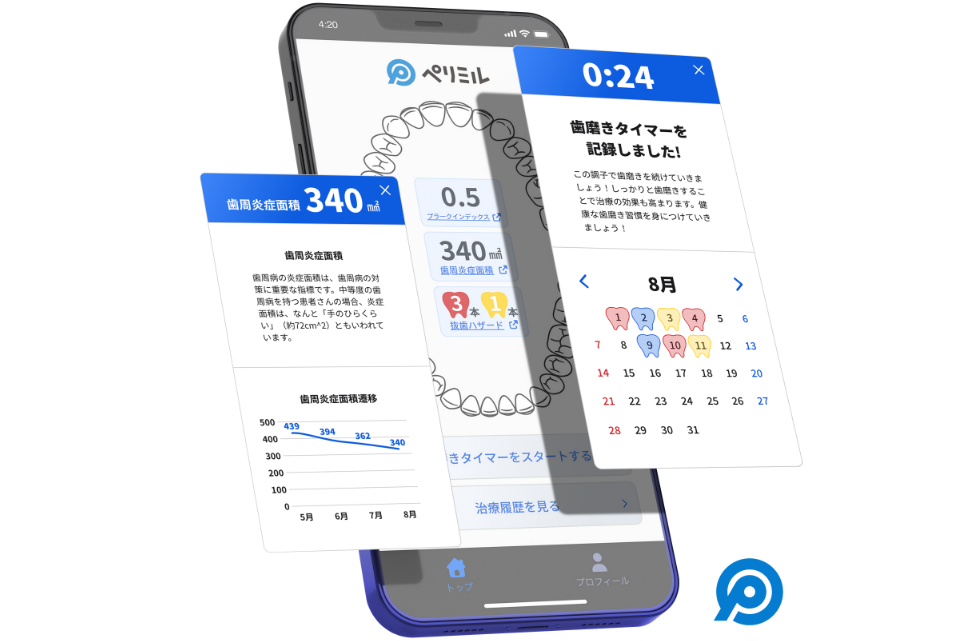 セルフケアアプリ「ペリミル」と連携することで、治療経過や歯ぐきの状態をスマホで簡単に見える化できます。