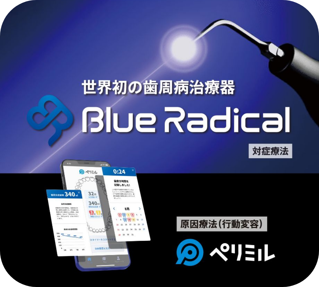 ブルーラジカルは、光と専用ジェルで歯周病菌だけを効率よく除去する新しい治療法です。メスを使わず痛みや腫れを抑えられるため、短時間で安心して治療を受けられます。抗生物質に頼らず治療できるため、痛みが苦手な方・忙しい方・再発を防ぎたい方にもおすすめです。